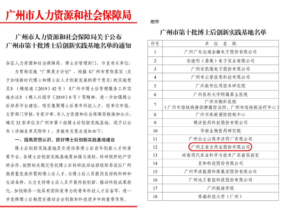 一、王老吉藥業獲認定為“廣州市博士后創新實踐基地”