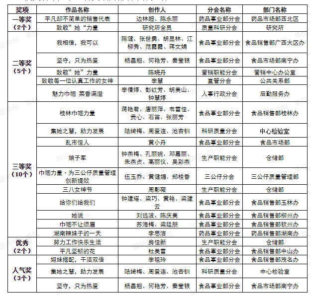 2月14日至2月28日,工會舉辦主題為“創新提效?巾幗力量”的三八婦女節短視頻比賽。共收到參賽作品33個。視頻作品以公司女職工工作崗位、工作內容、工作場景為主要內容,貼合活動主題,體現王老吉藥業女職工的巾幗精神,表達的思想積極健康、表現力強、真實發生、情感真摯。通過評比和網上投票,在三八當天中午公布了評比結果,共評出獲獎作品22個,其中一等獎2個、二等獎5個、三等獎10個、優秀獎2個、人氣獎3個。