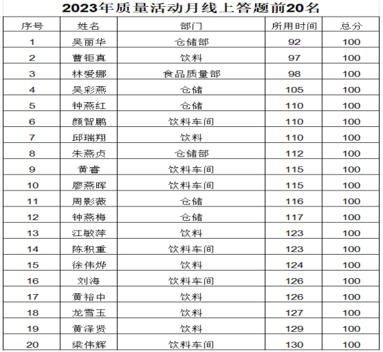 首先登場的節(jié)目是食品安全和ISO9001、ISO22000雙體系知識競賽,此競賽是本次質(zhì)量月活動的重點(diǎn)項(xiàng)目,分為線上、線下兩種競賽方式,其中線上通過二維碼參與,截止后共有1376人參與(基本涵蓋食品相關(guān)的人員,體現(xiàn)食品安全,全員參與的質(zhì)量方針),其中滿分231人,最快成績92秒,平均一秒多一道題。以下為滿分且速度較快的前20名:
