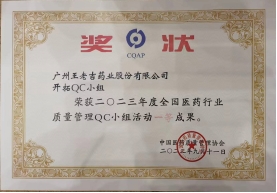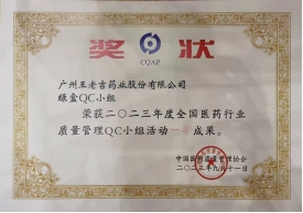 飲料車間發表的《降低使用國產包材的設備故障率》 QC成果,榮獲2023年廣州市質量管理小組成果發表二等獎、第44次全國醫藥行業質量管理小組成果發表一等獎。
