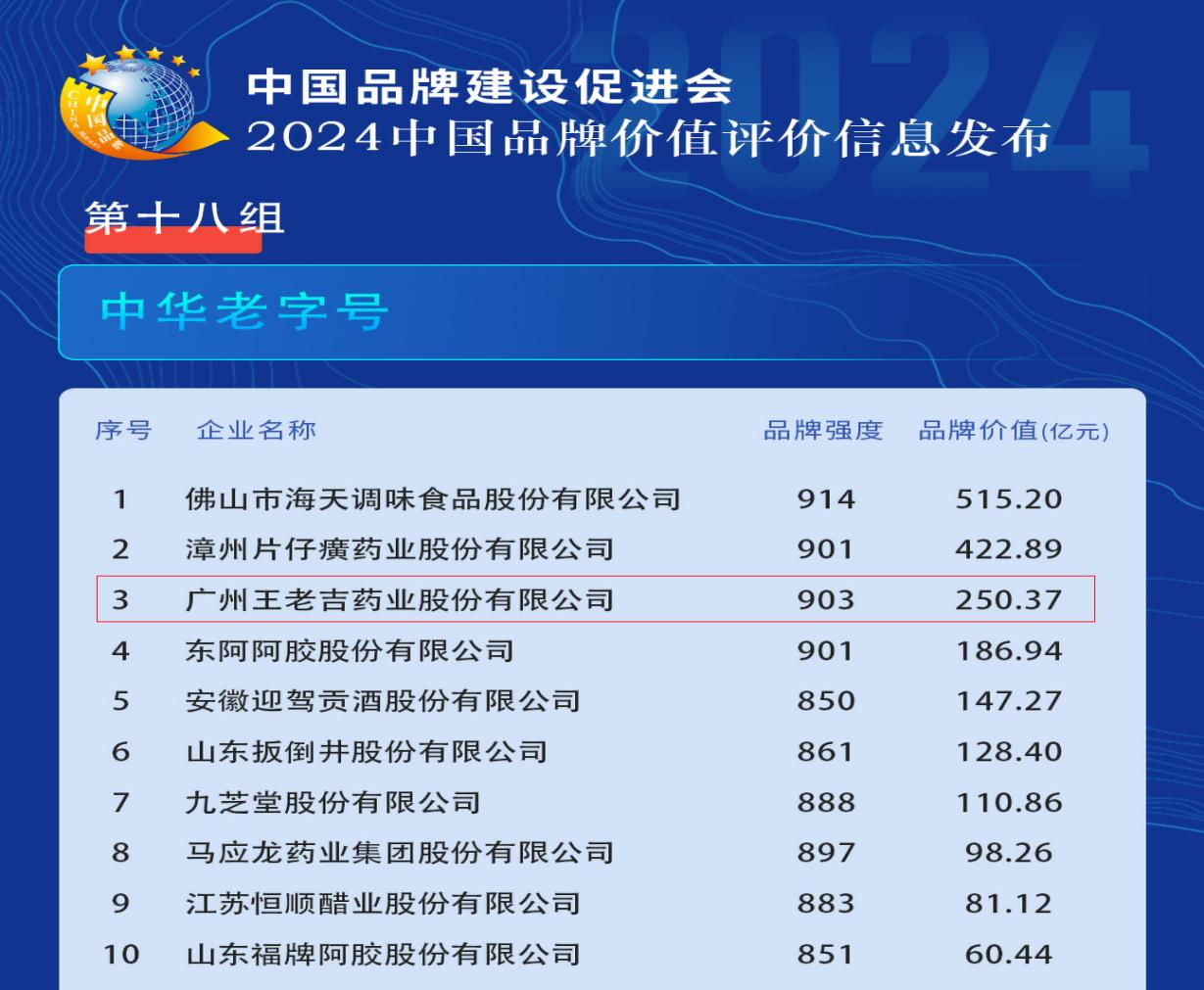 2024中國品牌價值評價信息發布,王老吉藥業以品牌價值250.37億元,比去年提高了9.18億元,位列中華老字號榜單第三名,繼續書寫著傳統與現代完美融合的品牌傳奇