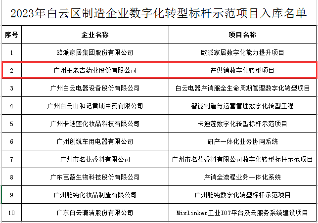 廣州市白云區科技工業商務和信息化局根據《關于印發2023年白云區制造企業數字化轉型標桿示范項目申報指南的通知》要求,經企業申報、專家評審、征求有關部門意見等程序,王老吉藥業提報的“產供銷數字化轉型項目”成功入庫。 -