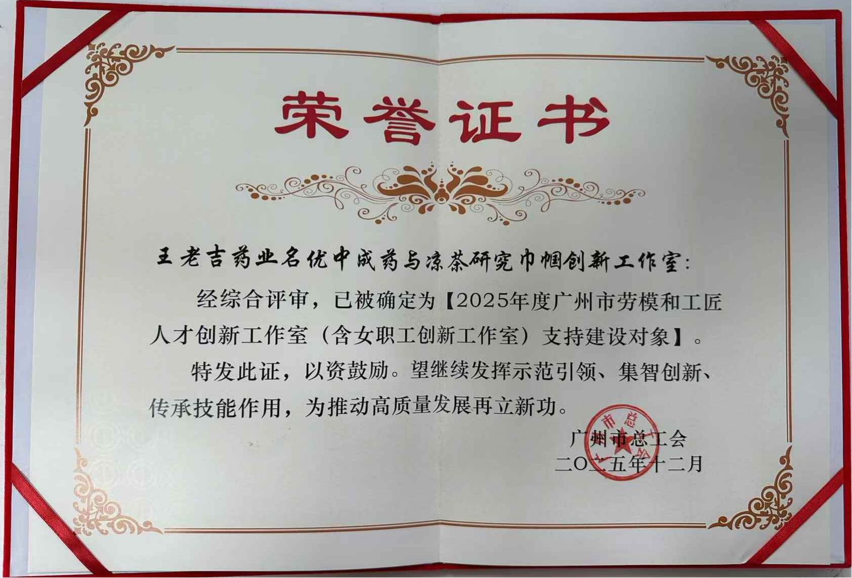 廣州市總工會(huì)為廣州王老吉藥業(yè)“名優(yōu)中成藥與涼茶研究巾幗創(chuàng)新工作室”頒發(fā)廣州市勞模和工匠人才創(chuàng)新工作室稱號。 -