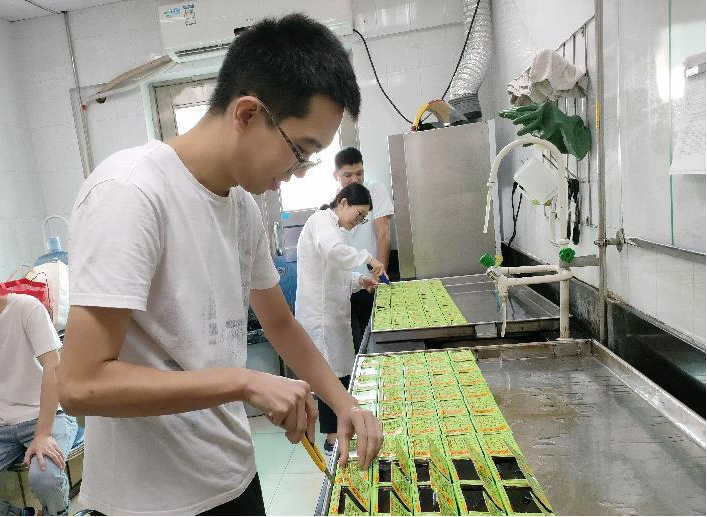 看!打檢開包試驗速度比拼也已拉開帷幕了,此過程為涼茶產品批次質量和貨架期質量驗證最重要的檢測程序之一。看:參賽選手們對著一盤55包的樣品,手拿利刀,出手要快,姿勢要帥,在這基礎上還是要安全快速才最為重要。在這打檢開包比賽中,比賽者謹記“一橫二豎三角度,四刀五邊六力度”的口訣,憑借著獨一無二的訣竅,看誰能脫穎而出,靠的還是技術活啊!只見一快刀手,55包的樣品在不到1分半的時間內,一包包充滿香氣,晶瑩剔透的涼茶已呈現在評委的眼前。此時此刻,或許評委品的不是涼茶,更多的是驚嘆其精湛的技術吧。經過激烈比賽,由食品質量部的廠部同事和OEM品控駐點包攬了前三名,他們分別是第一名林灼勤,第二名葉揚威和胡素輝,第三名鄭穎俊、鐘飛虹和成偉杰。