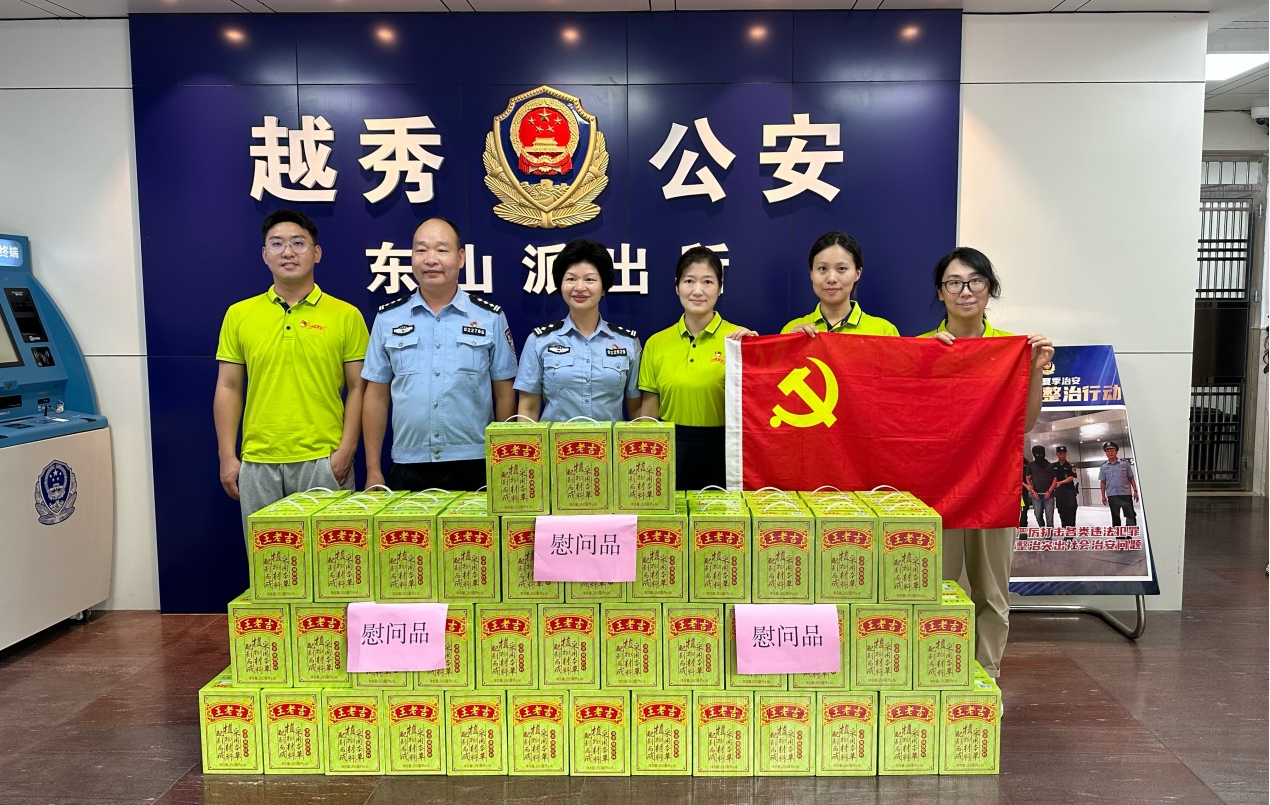 8月上旬,王老吉藥業第二黨支部、第三黨支部黨員及青年文明號電商部成員在第二黨支部書記鄭少玲和營銷中心辦公室主任陳曉丹帶領下,前往越秀區公安分局東山派出所、東山街市容環境衛生管理站等進行慰問活動并為他們送上防暑降溫的王老吉涼茶。