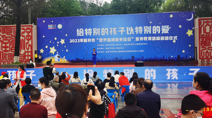 這天,在韶關市中山公園,開啟“走近星星的孩子—給特別的孩子以特別的愛” 2023年韶關市“世界自閉癥關注日”宣傳教育活動啟動儀式,現場有自閉癥兒童表演節目、現場派發藍絲帶、及自閉癥康復治療宣傳等相關活動、游戲。